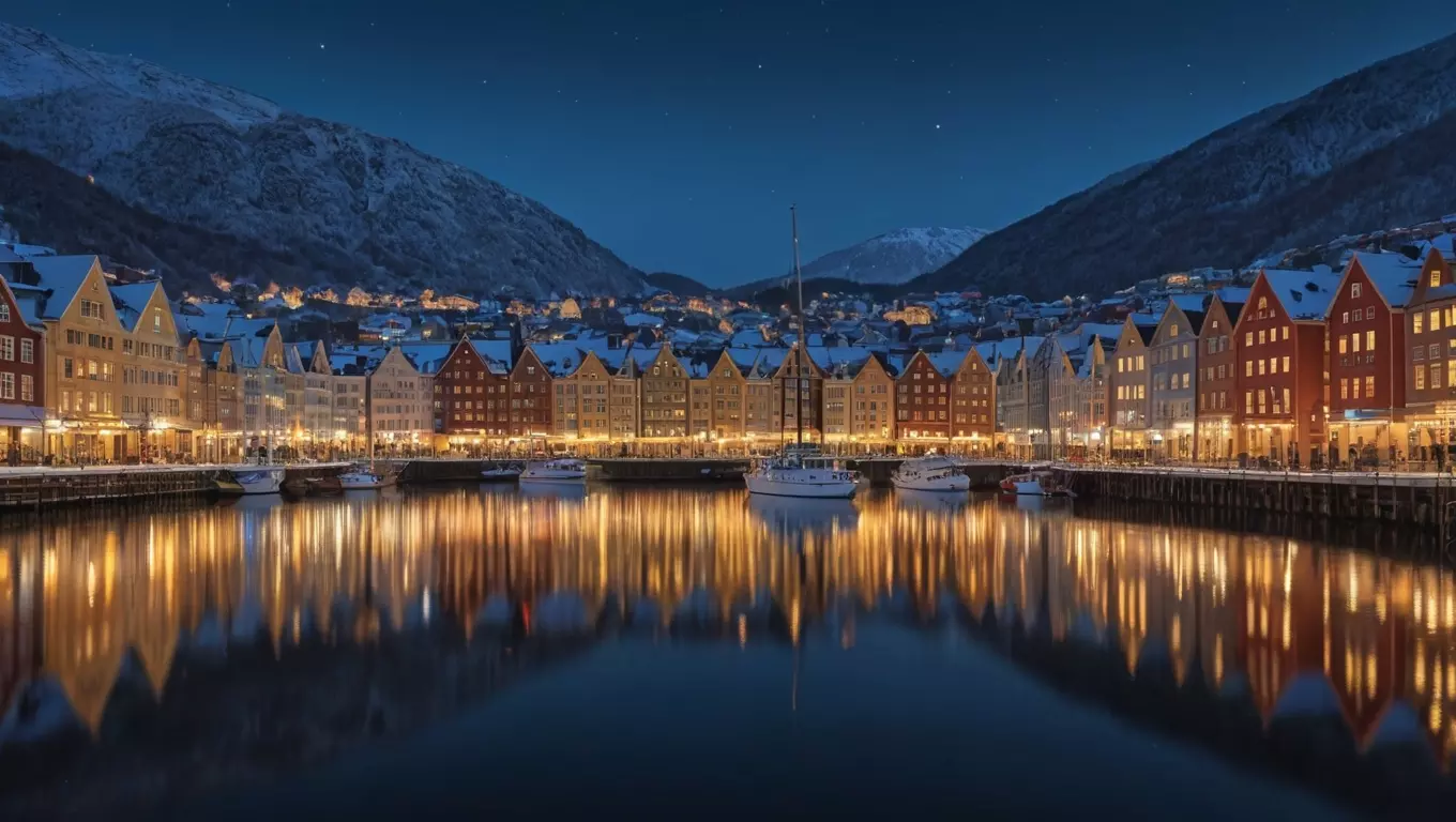 Những đêm mùa đông ở thành phố Bergen có chất lượng thanh tao, với ánh đèn thành phố phản chiếu những con đường phủ đầy tuyết và các tòa nhà lịch sử. Các điểm du lịch nổi tiếng, như Bryggen và Fløibanen, mang một ánh sáng kỳ diệu dưới bầu trời trong xanh, đầy sao.